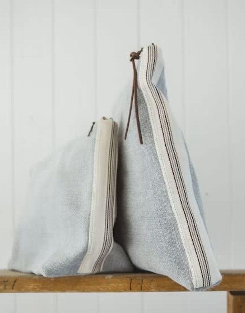 The cosmetic bag is lined with an oyster linen and finished on the outside with a striped cotton trim over one side seam. The zipper closure is finished with a leather pull.